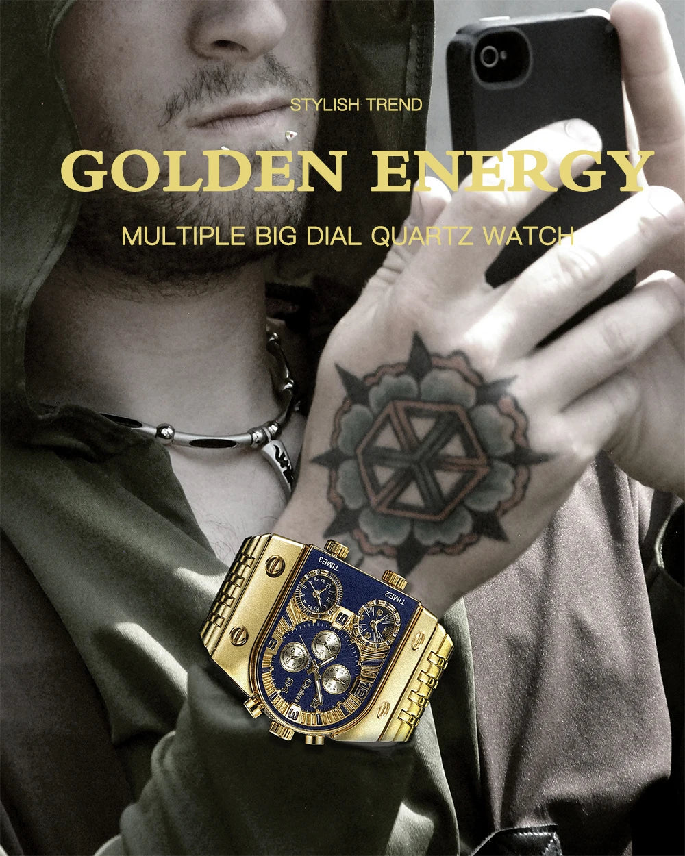 Son large cadran multi-zones, son boîtier doré et son affichage lumineux en font un accessoire à la fois pratique, imposant et original.